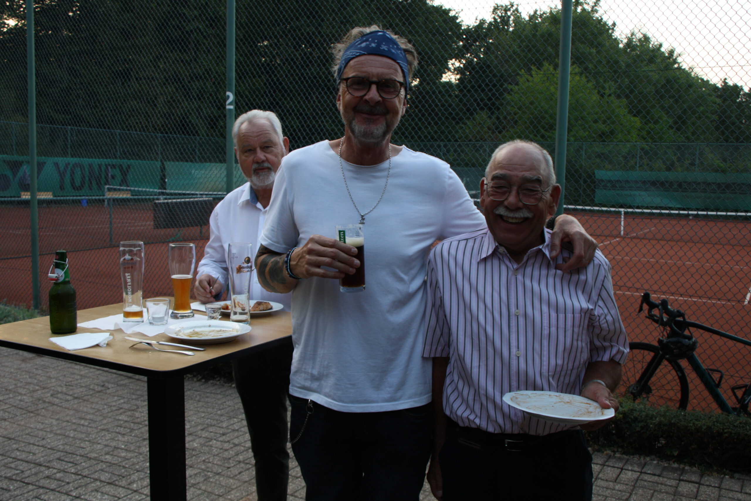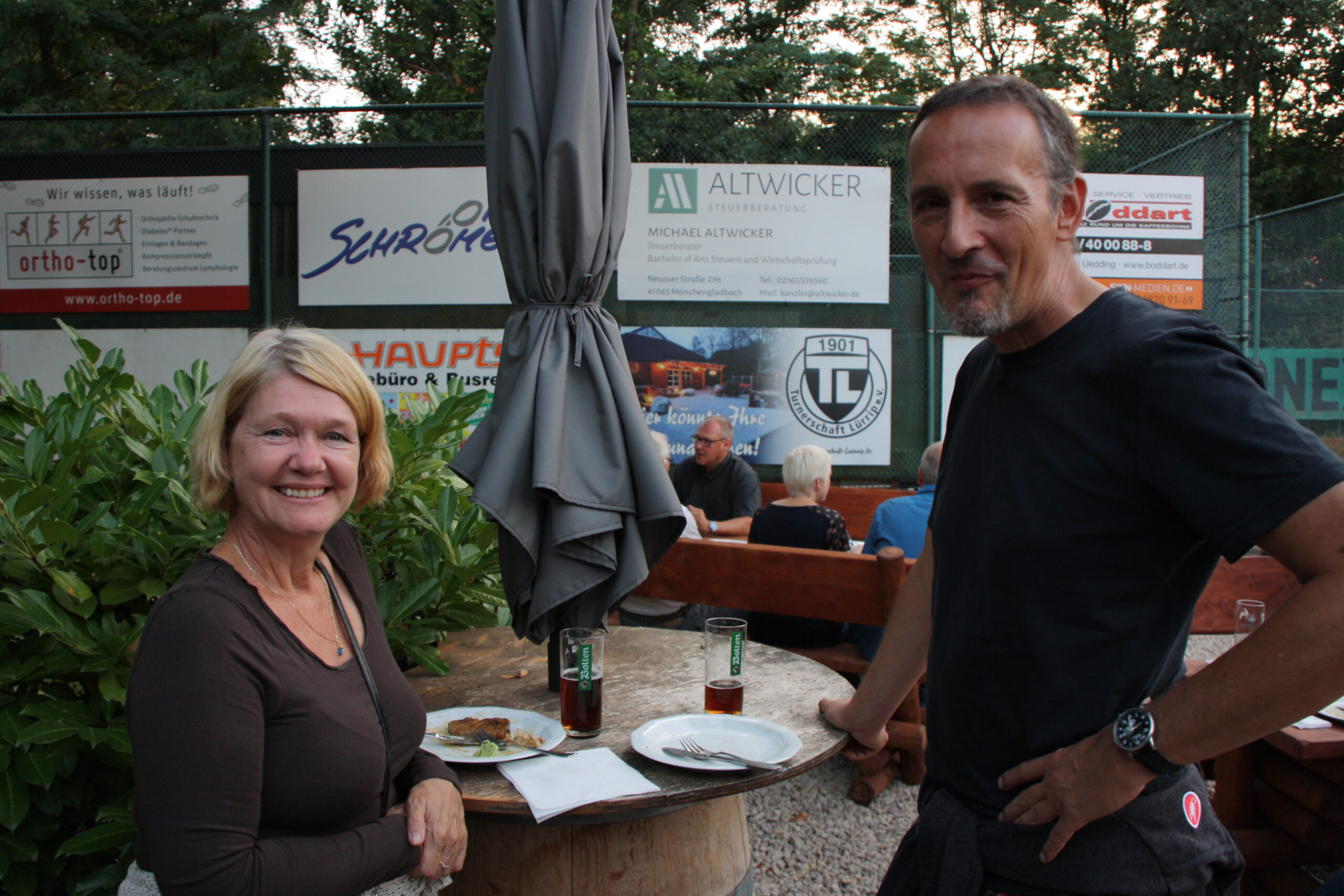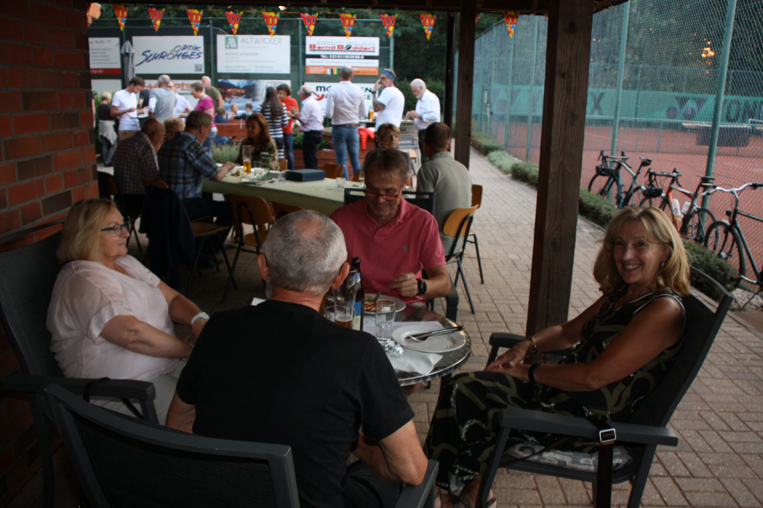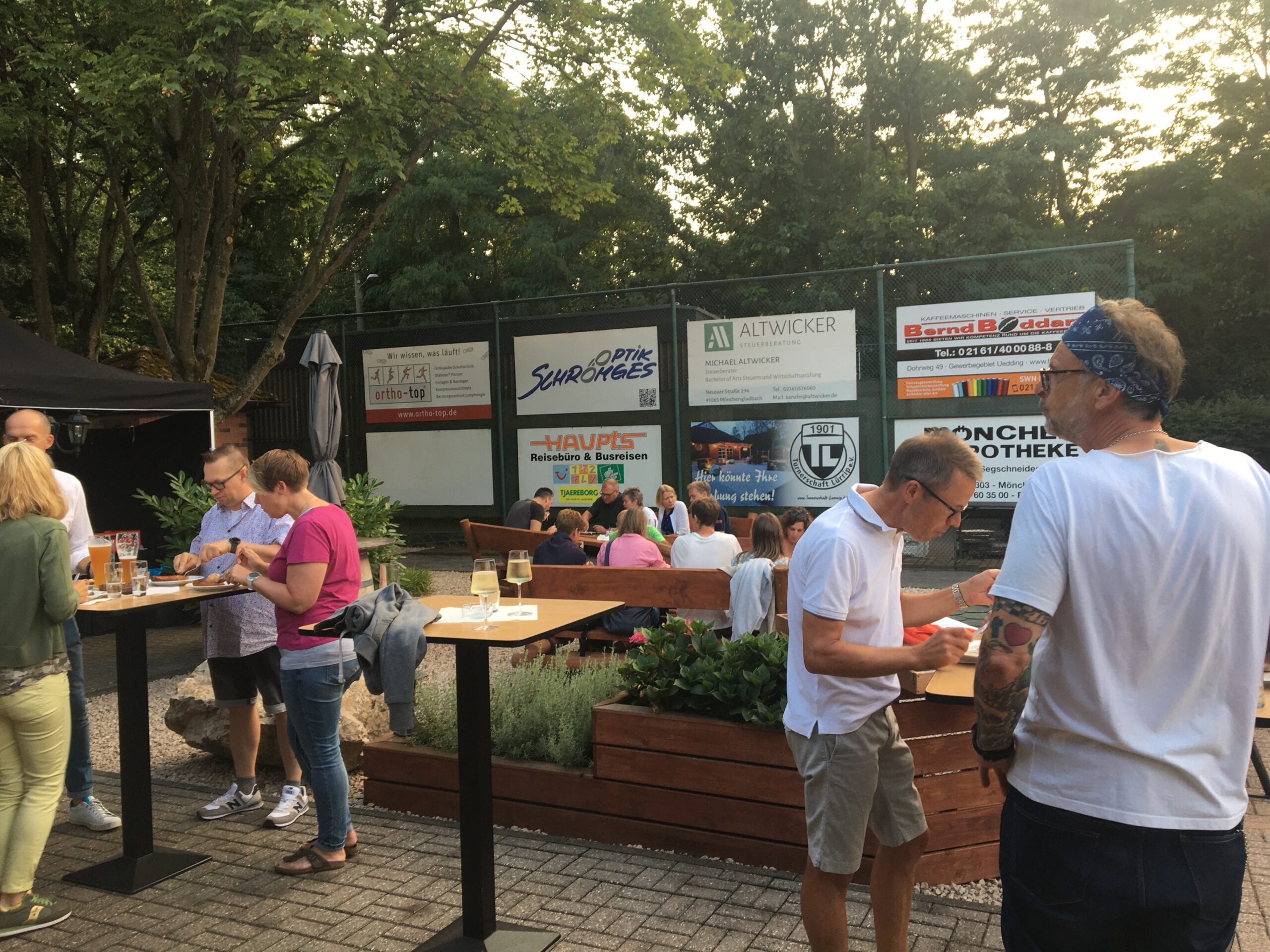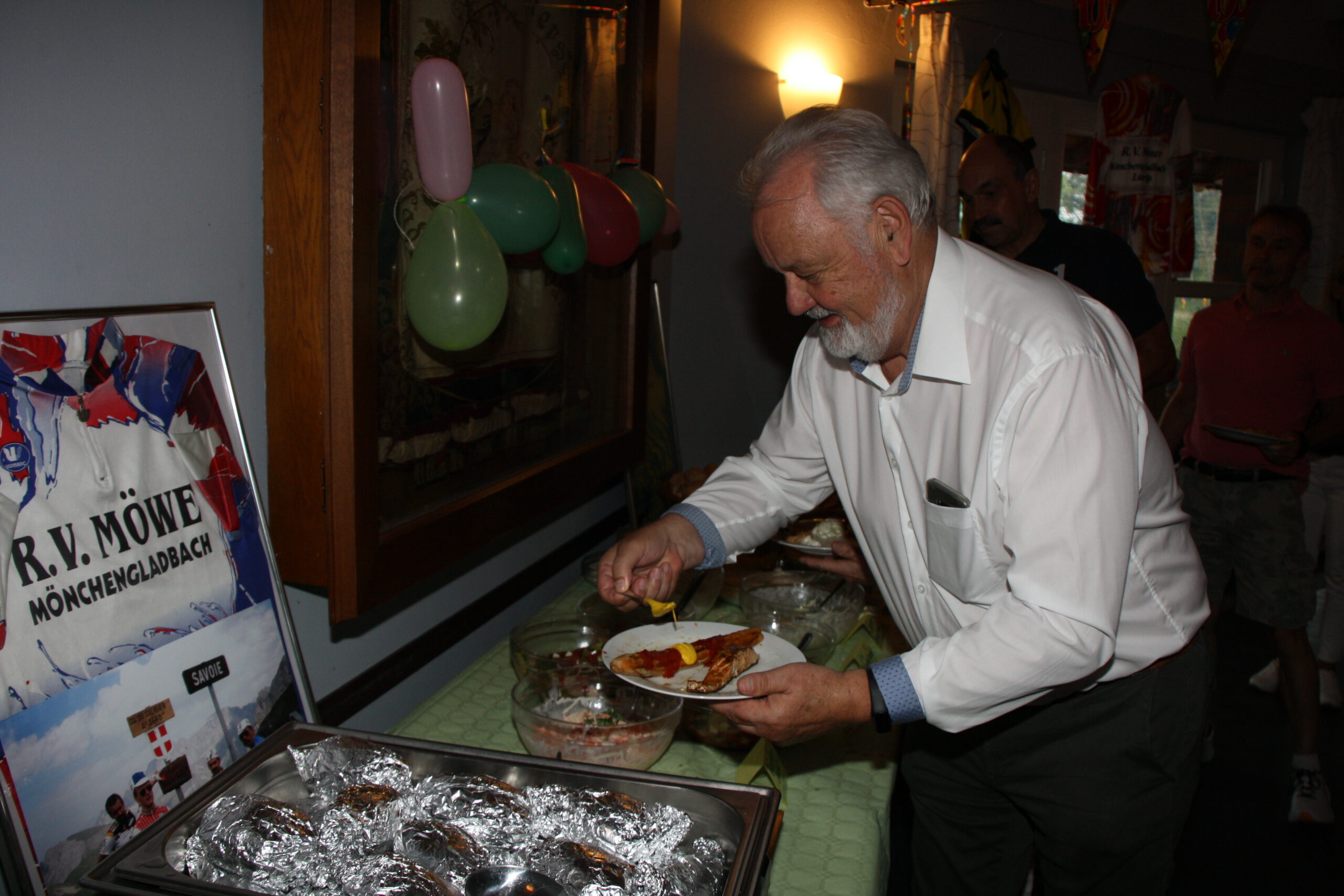 Baumanns Catering komplettierte den Biergarten mit einer sehenswerten Grillstation, die am Abend mit Fisch, Fleisch und vegetarischen Köstlichkeiten bestückt war. Um 19.30 Uhr konnten wir unsere Gäste begrüßen, Günter Dauven vom Radsportbezirk Mönchengladbach und Dieter Kauerz vom Stadtsportbund, Frank Günther von den Grenzfahrern, unsere Sponsoren Angelika Schmilewski und Dieter Schon von bikefriends-schon, Familie Sören Sauer vom thebikeshop.de.