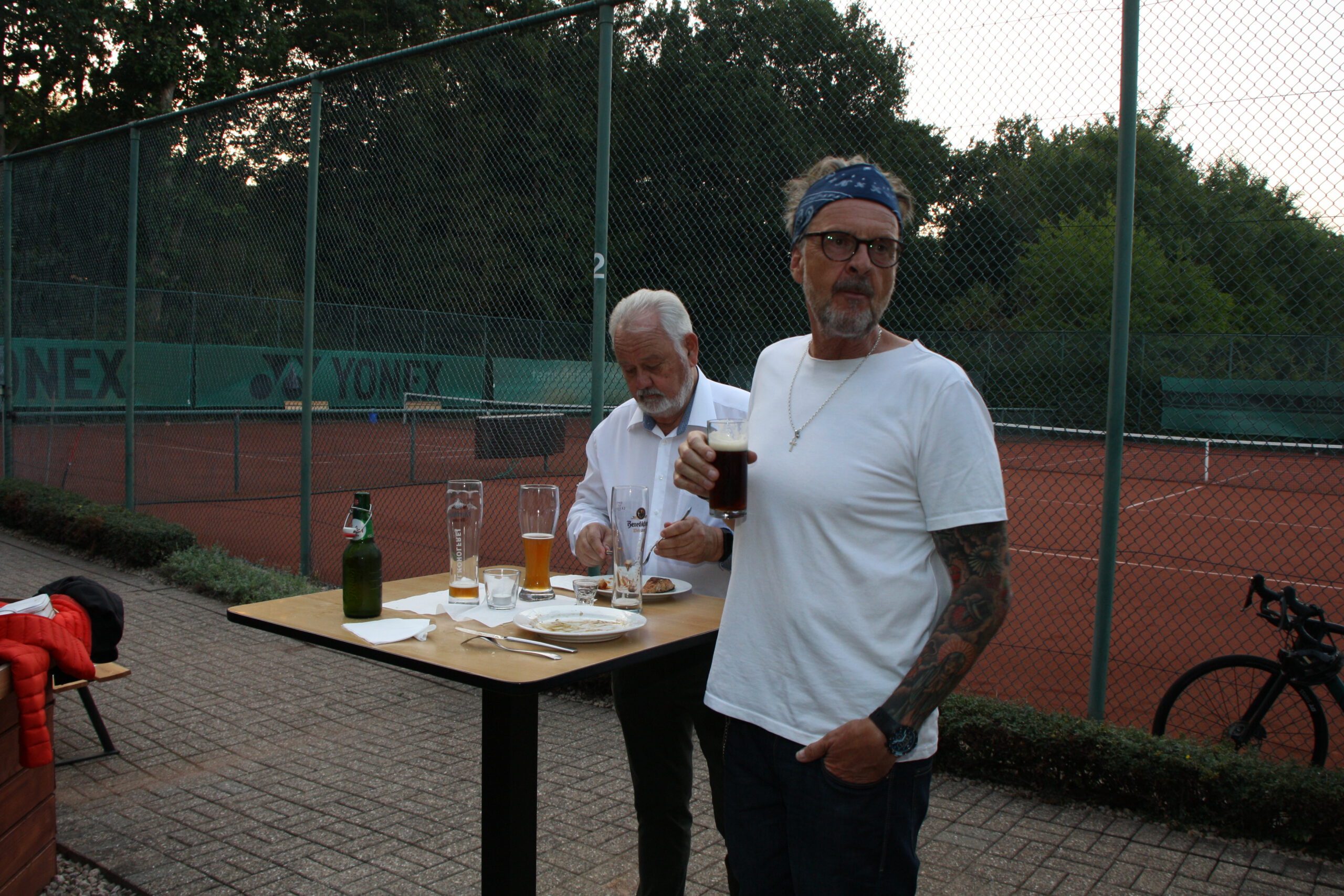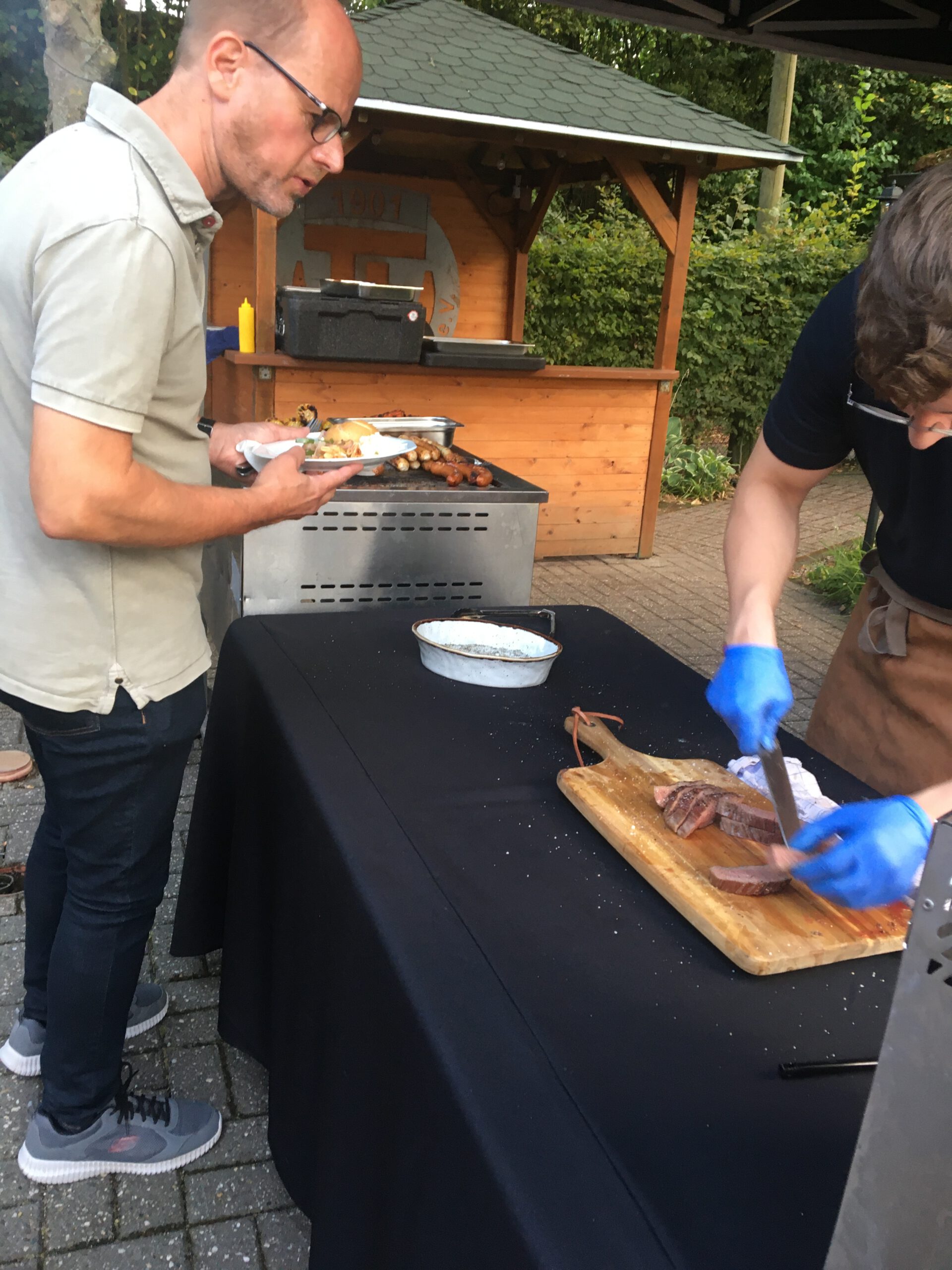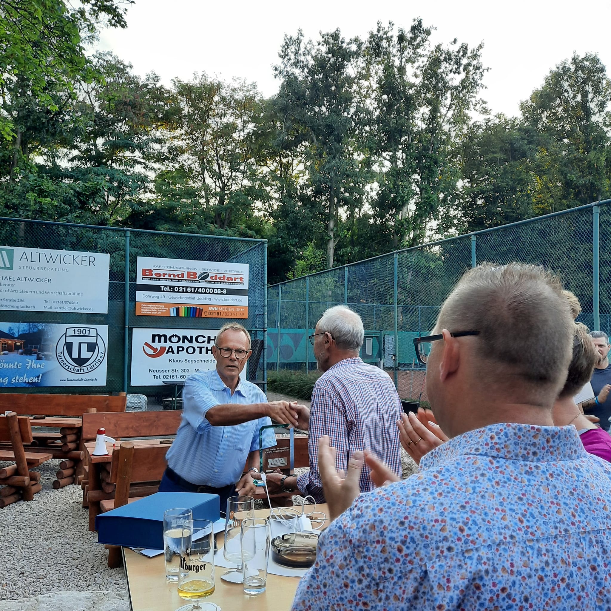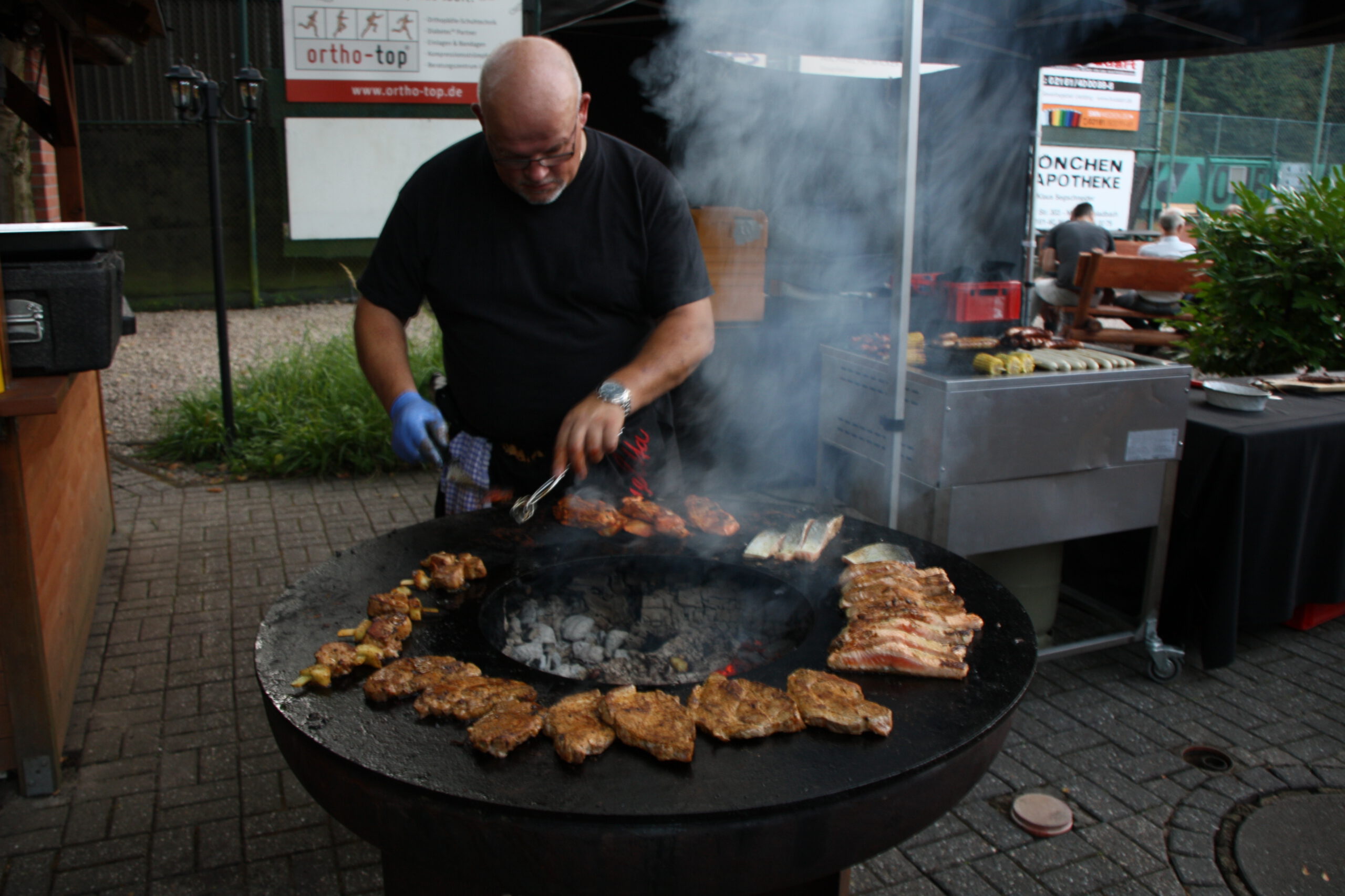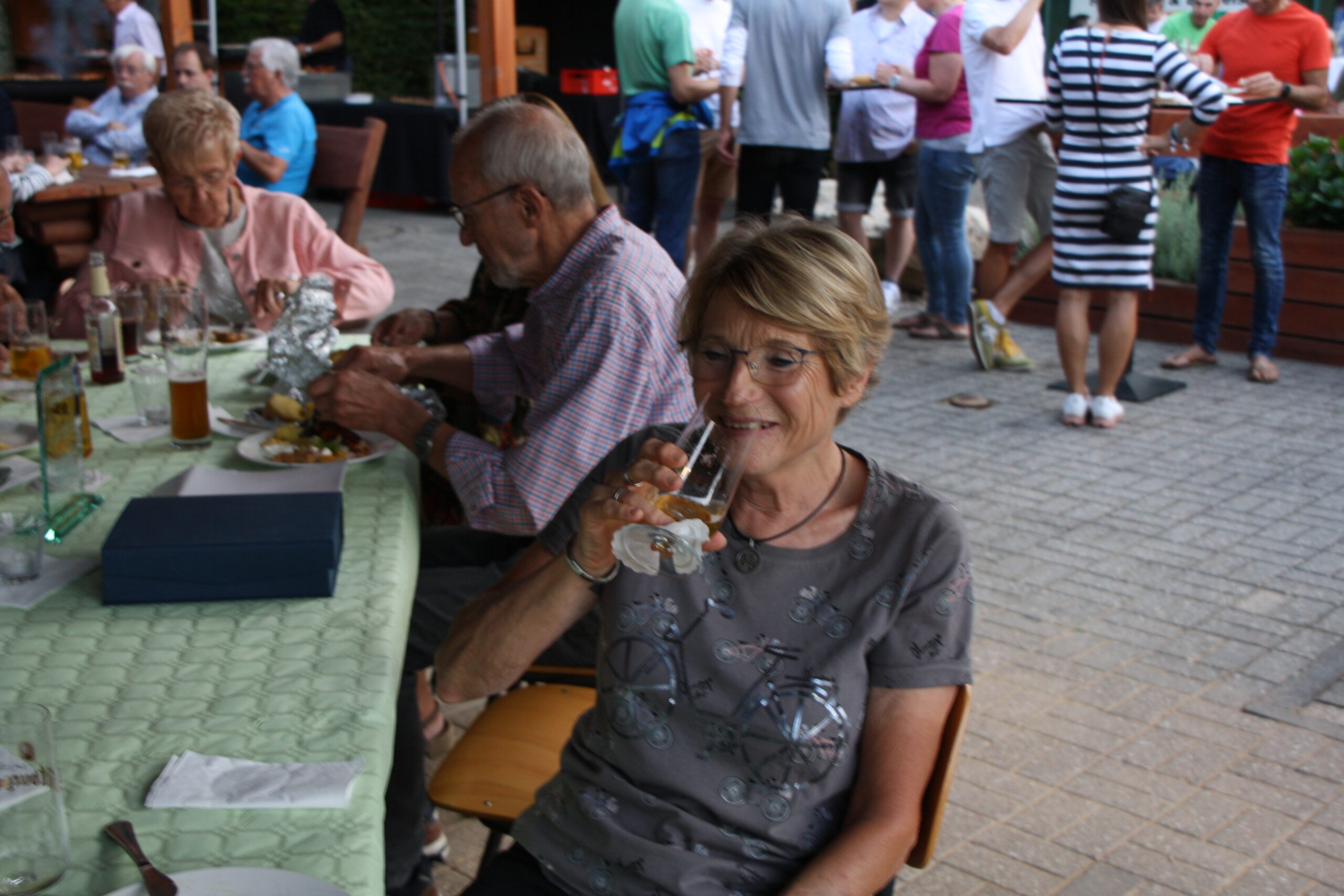 Baumanns Catering komplettierte den Biergarten mit einer sehenswerten Grillstation, die am Abend mit Fisch, Fleisch und vegetarischen Köstlichkeiten bestückt war. Um 19.30 Uhr konnten wir unsere Gäste begrüßen, Günter Dauven vom Radsportbezirk Mönchengladbach und Dieter Kauerz vom Stadtsportbund, Frank Günther von den Grenzfahrern, unsere Sponsoren Angelika Schmilewski und Dieter Schon von bikefriends-schon, Familie Sören Sauer vom thebikeshop.de.