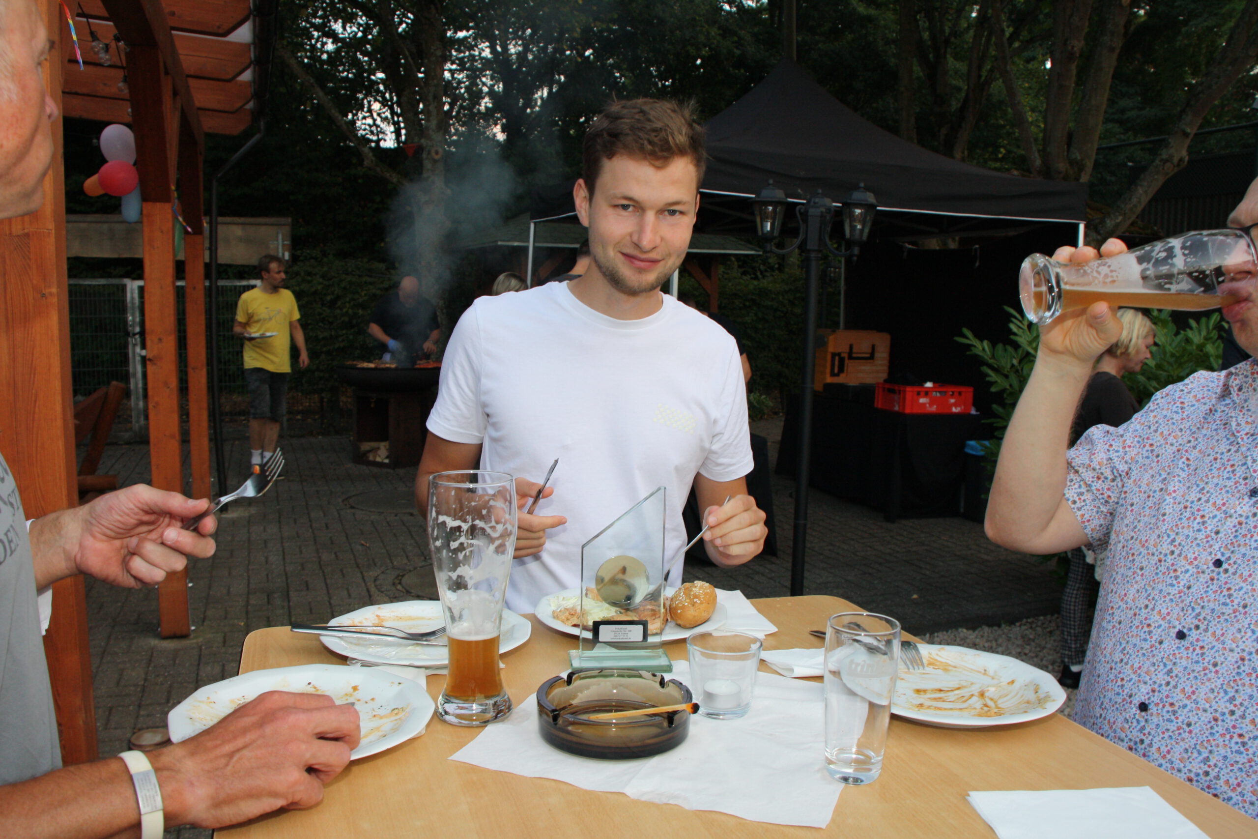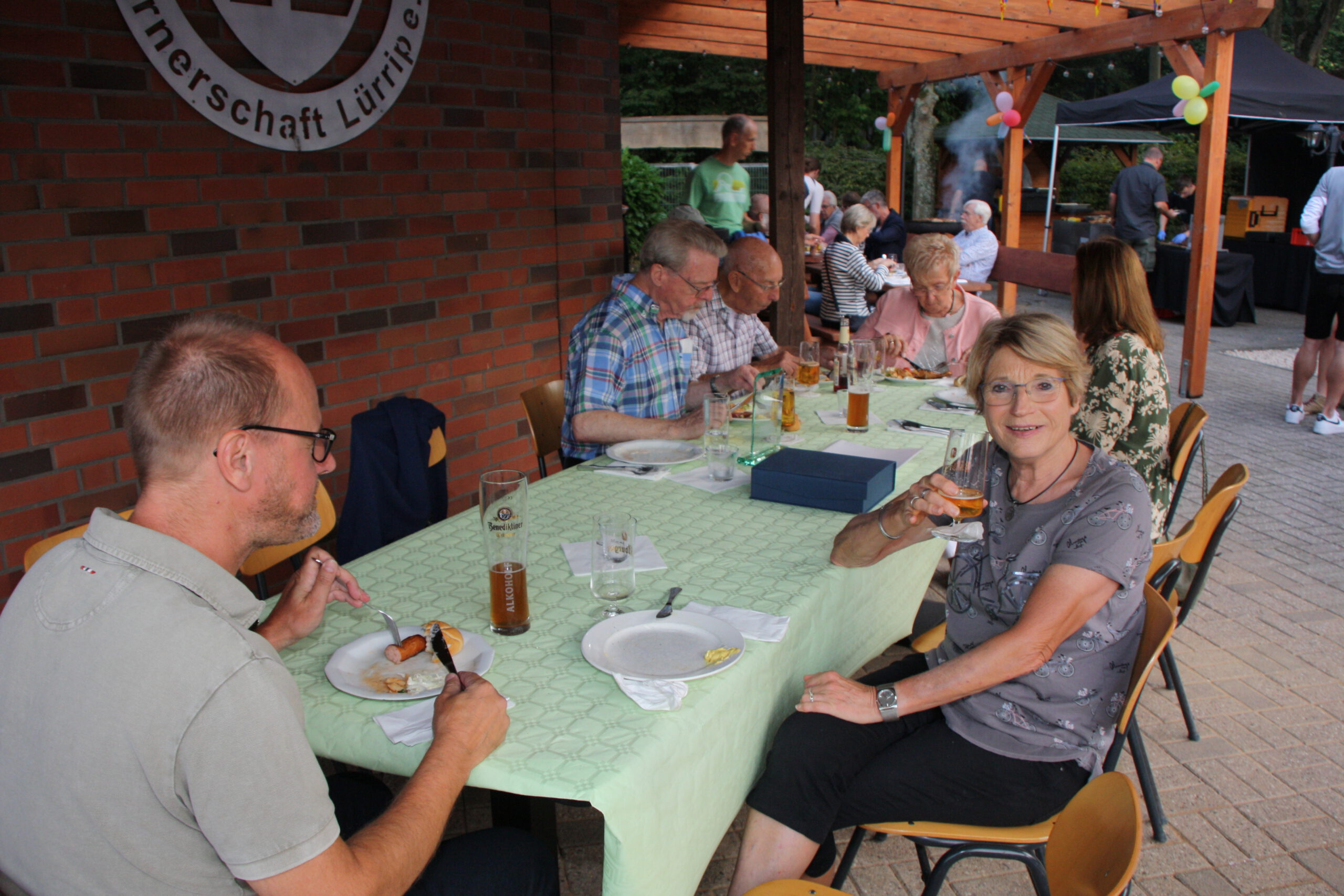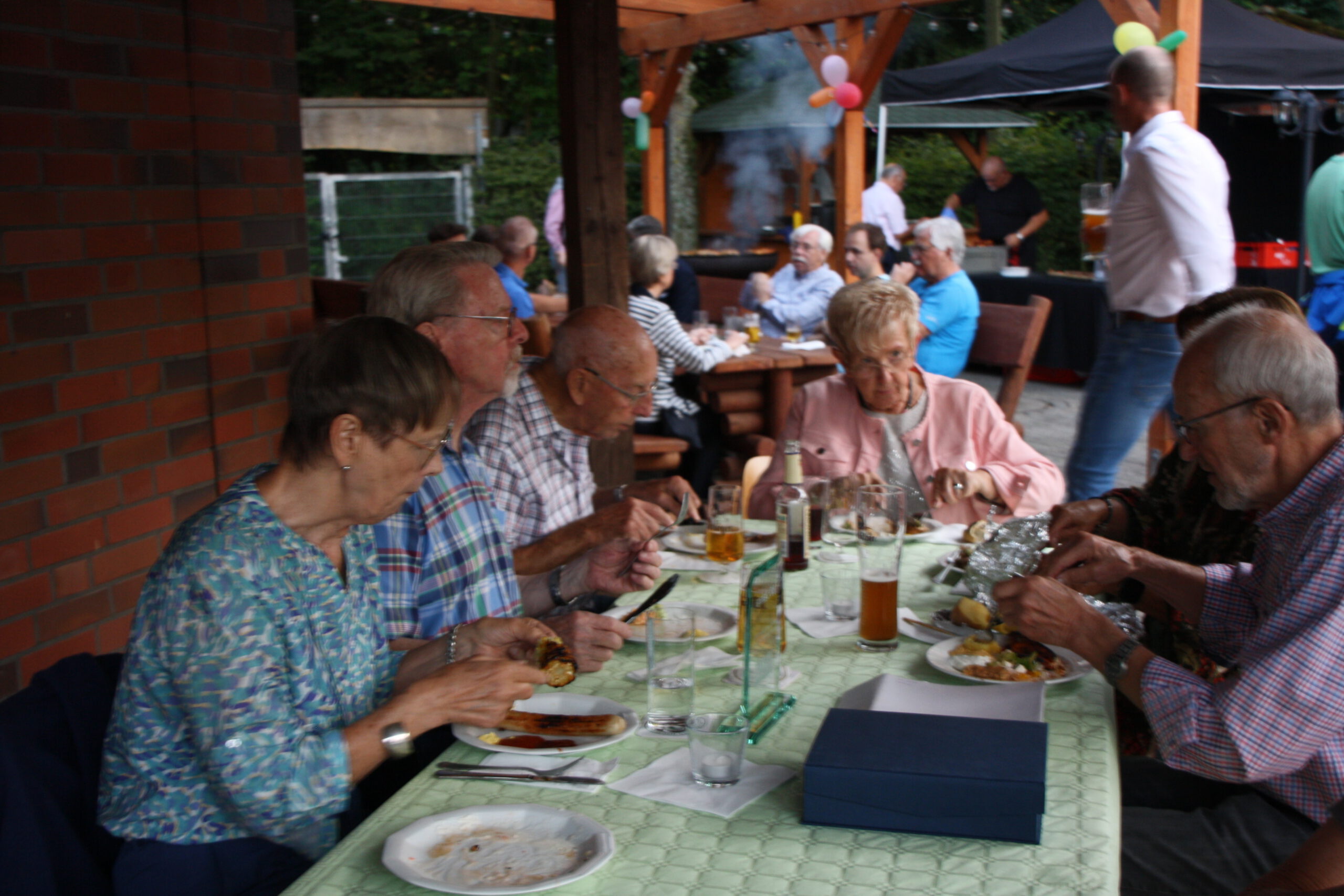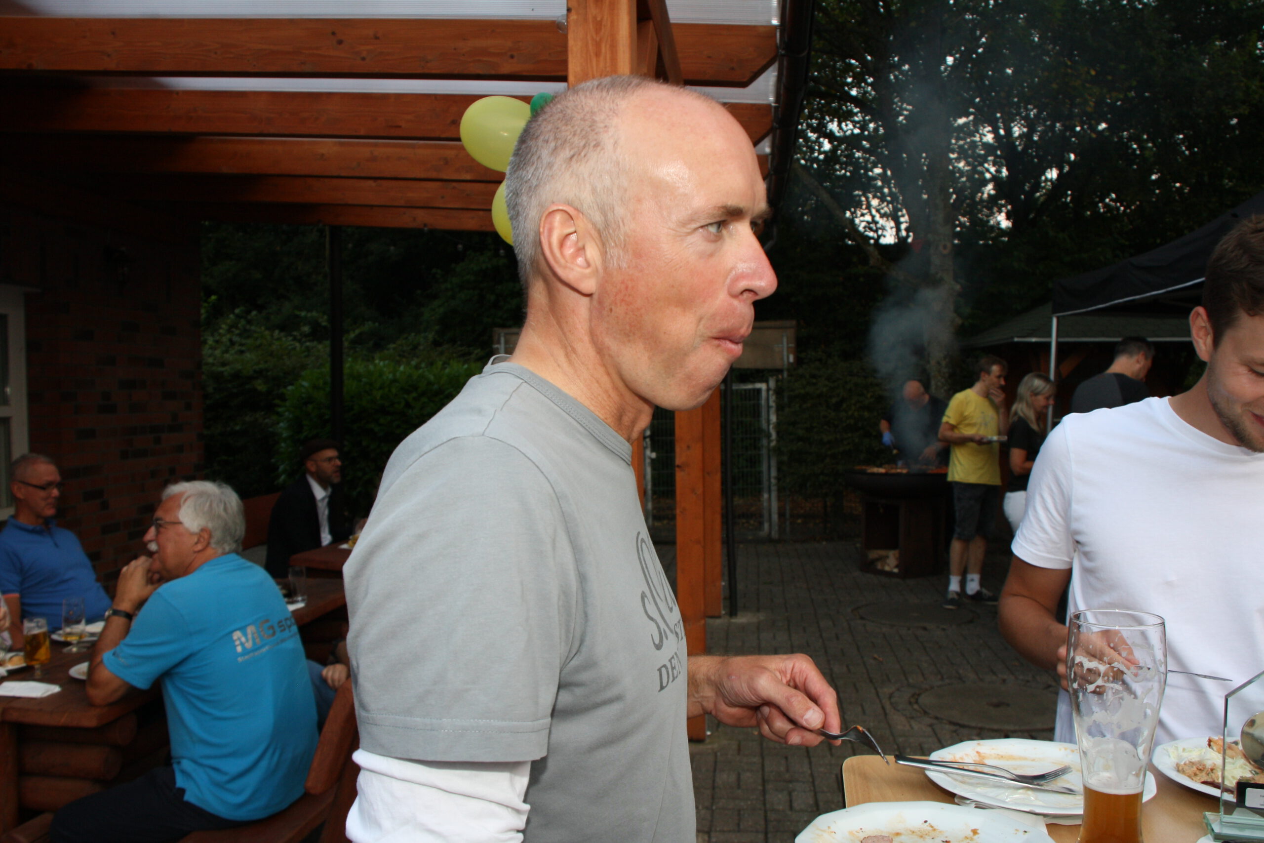 Danach war die Festgesellschaft kaum noch zu bremsen, da der Geruch von Gegrilltem die Nase angenehm reizte. Das Grillbuffet wurde eröffnet. Der Abend war für viele ein Wiedersehen nach langer Coronapause und selbst ich musste den einen oder anderen Helmlosen nach dem Namen fragen. Dieter Kauerz hielt nach dem Buffet eine kurze Rede. Am frühen Sonntag endete die Feier und Sonntagmorgen waren wieder ein paar hartgesottene unterwegs zum „Kilometerfressen“ oder „Kalorienverbrennen“.